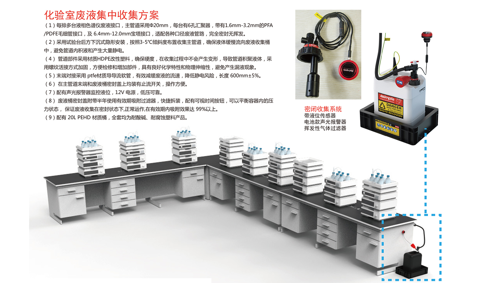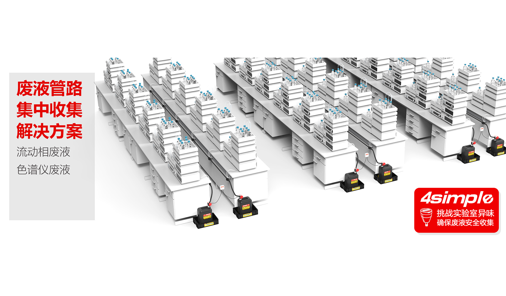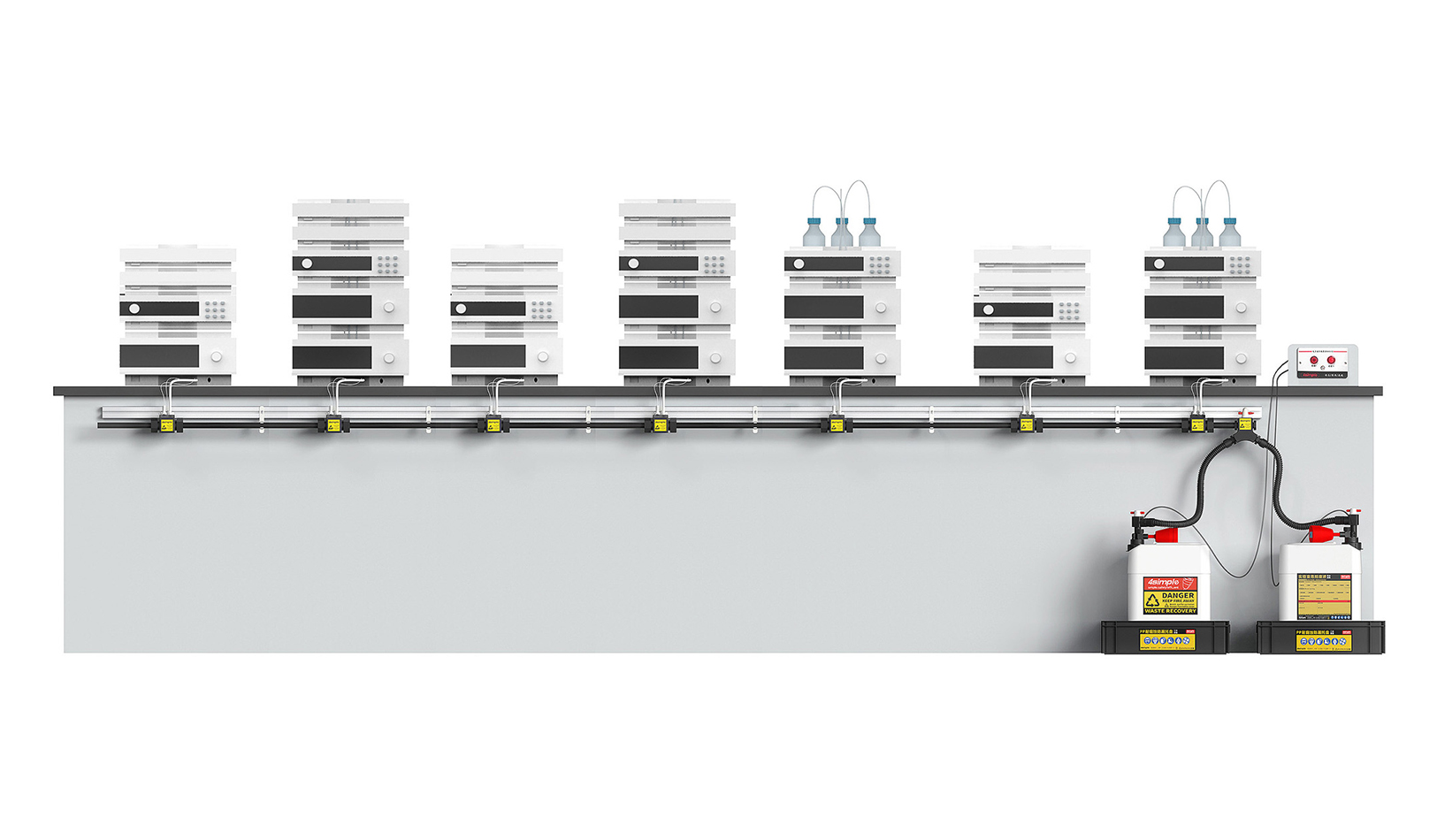 4SIMPLE管路集成式廢液收集系統(tǒng),主要用于實(shí)驗(yàn)室儀器廢液的集中收集,儀器廢液通過接口排入管路,廢液通過管路集中向廢液容器排放。集成式廢液收集系統(tǒng)可以減少實(shí)驗(yàn)室廢液容器數(shù)量,讓實(shí)驗(yàn)室更整潔。可以根據(jù)實(shí)驗(yàn)室儀器空間布局,提供不同形式定制安裝服務(wù)。