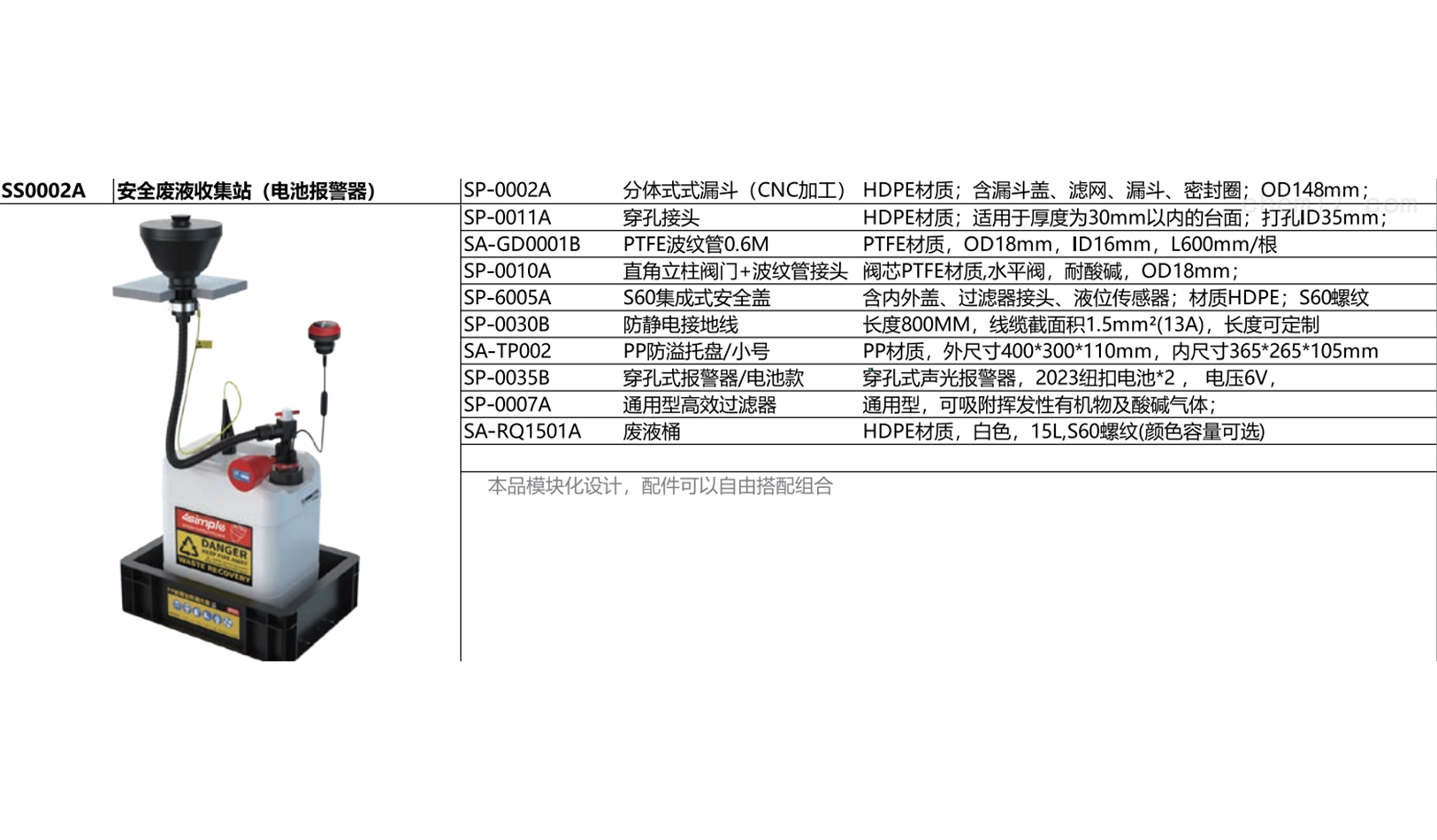 漏斗,桌面固定架,軟管,止流閥,過濾器轉(zhuǎn)換頭,安全蓋,廢液安全桶,堵漏托盤,報(bào)警器